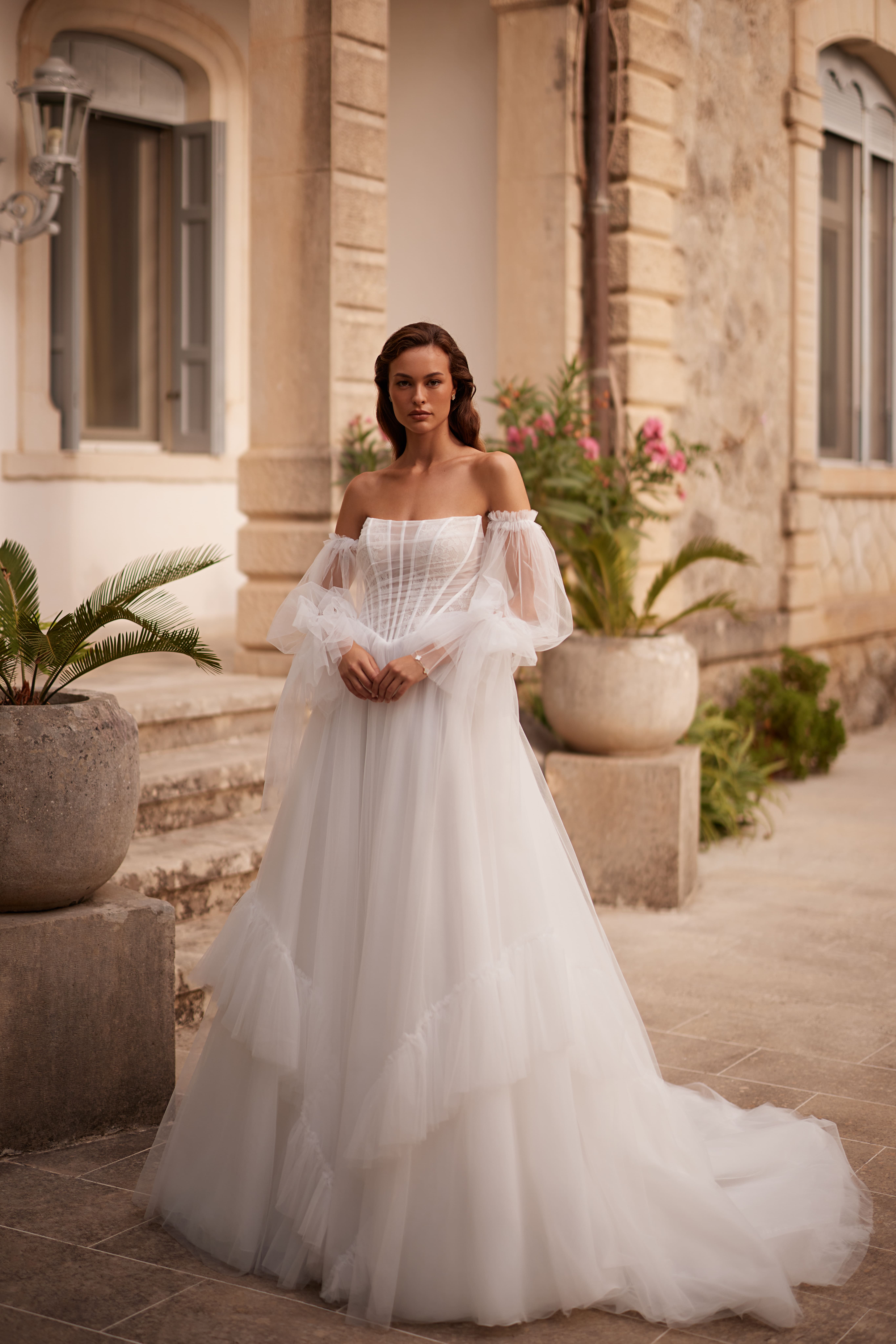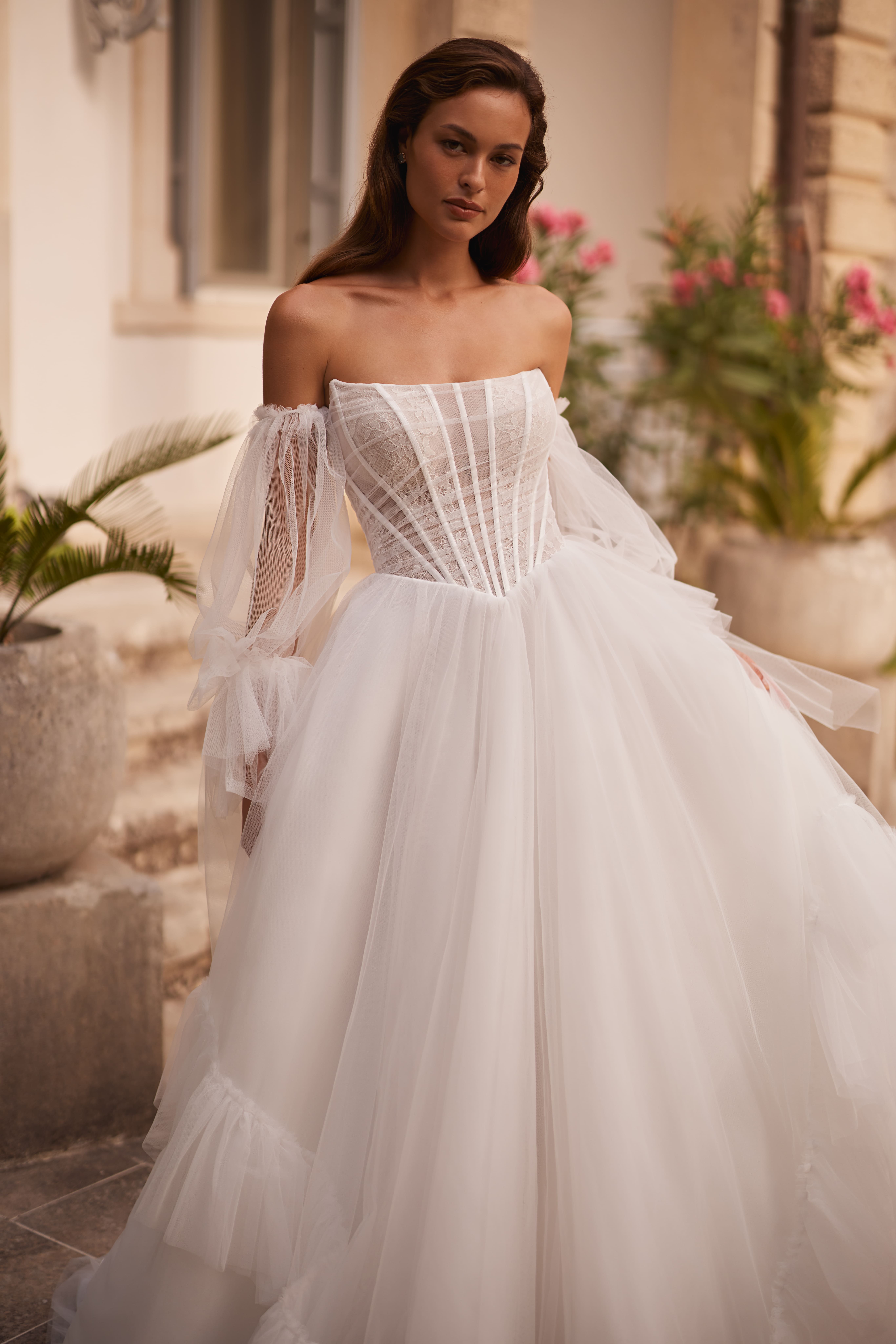 Oness — сукня для тих, хто цінує цілісність та стиль. Її чисті лінії й сучасний силует створюють відчуття гармонії й спокою, роблячи образ нареченої водночас стриманим і виразним.