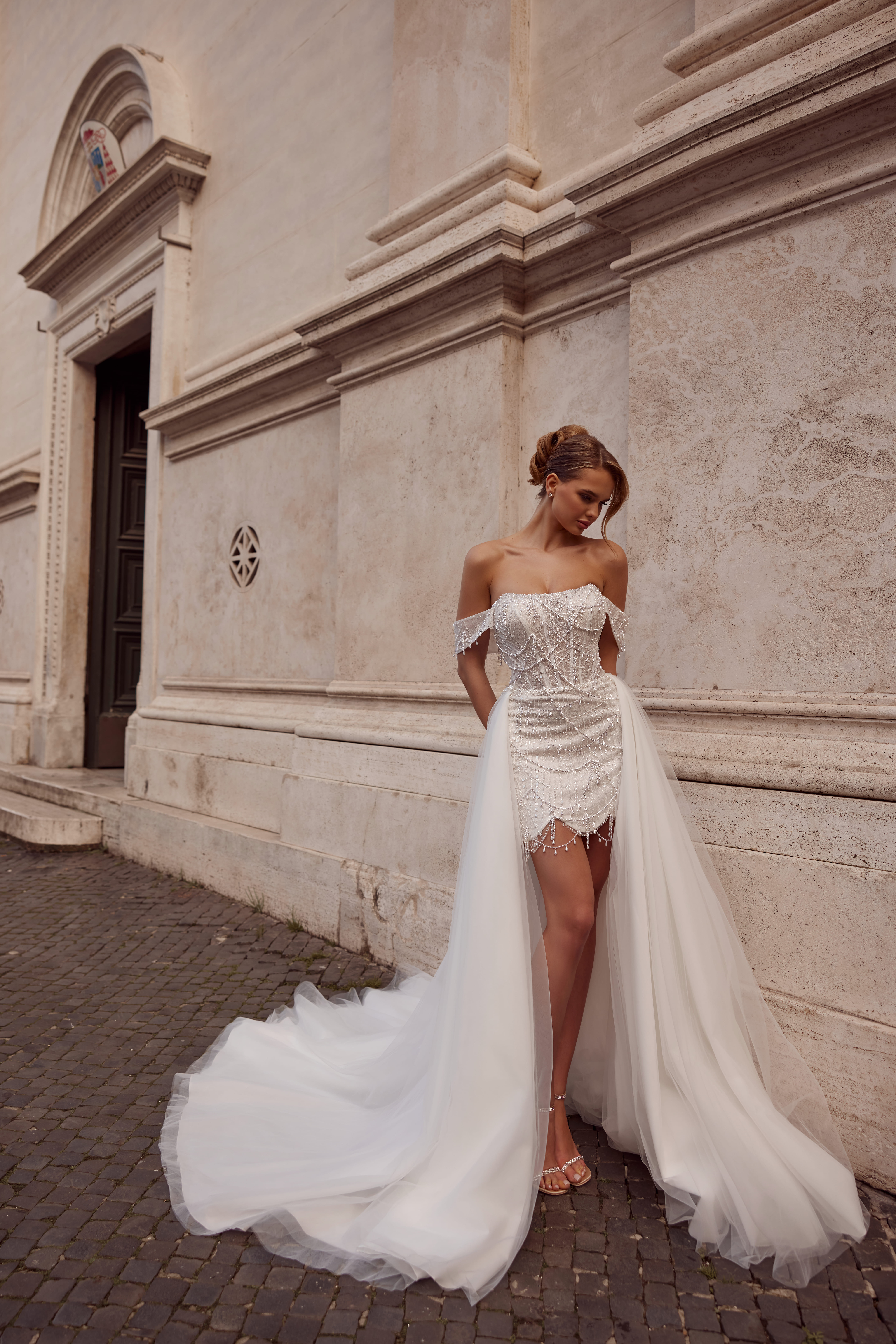 Riety — це кокетлива міні-сукня з розкішним бісерним корсетом і повітряним знімним шлейфом, що перетворює кожен крок на кінематографічний кадр. Відкриті плечі й акцент на ніжках надають образу легкої звабливості.